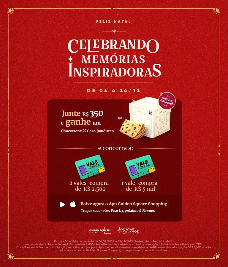 E tem mais. O cliente também terá direito a um Chocottone Casa Bauducco de 500g. Para participar basta cadastrar as notas fiscais no aplicativo do Golden Square - disponível para Google Play e Apple Store - resgatar um voucher e apresentá-lo no posto de troca localizado no Piso L3, próximo à Renner. A troca dos brindes (limitado a um por CPF).