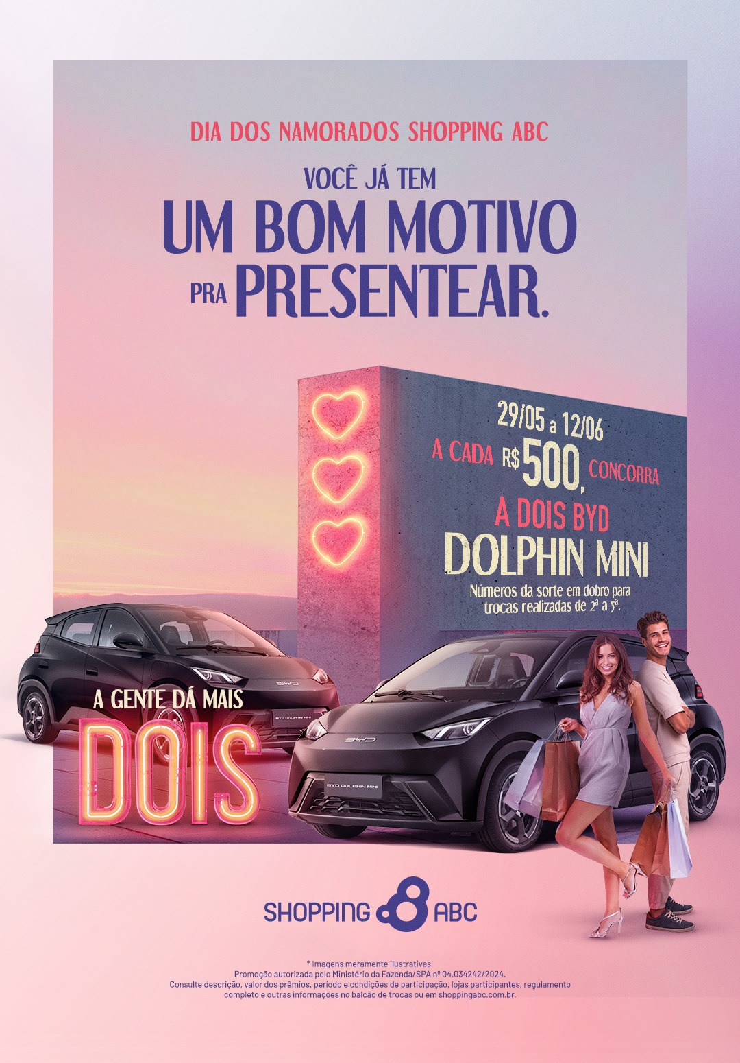 Entre os dias 29 de maio e 12 de junho, os clientes que garantirem o presente para seu amor no mix do empreendimento, podem participar do ‘Comprou, Concorreu’. Basta juntar 500 reais nas lojas e quiosques participantes, para ter direito a um número da sorte e concorrer a dois automóveis elétricos Dolphin Mini Polar, o compacto zero emissão da BYD, na cor preto, ano 2024/2025. Ou seja, um fica para o ganhador e outro ele presenteia seu par.