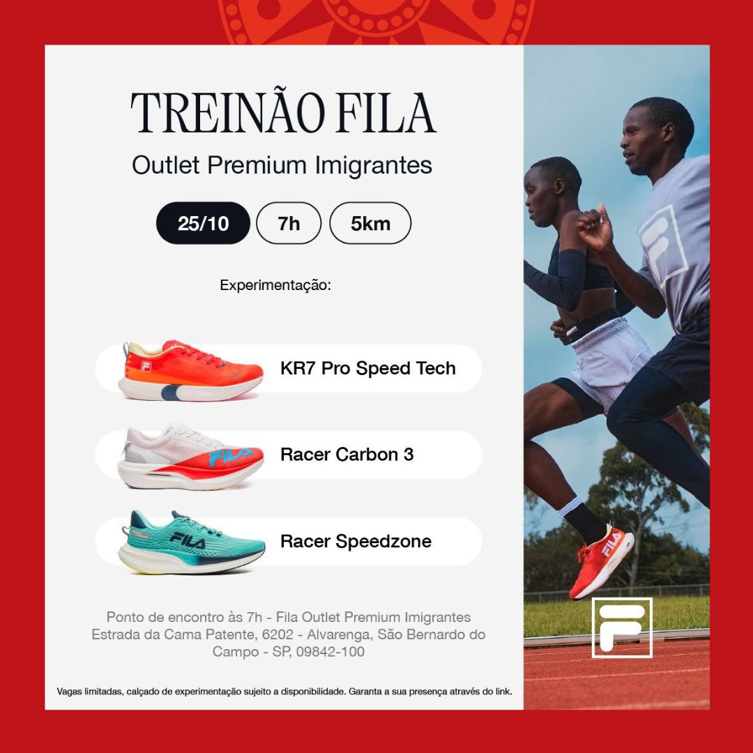 Durante a atividade, os participantes poderão experimentar modelos de tênis FILA, como KR7 Pro Speed Tech, Racer Carbon 3 e Racer Speedzone, disponibilizados ao longo de todo o treino, incluindo o aquecimento. Ao final, haverá um coffee break especial, proporcionando um momento de integração e descontração. As inscrições devem ser feitas previamente pelo link, com vagas limitadas.