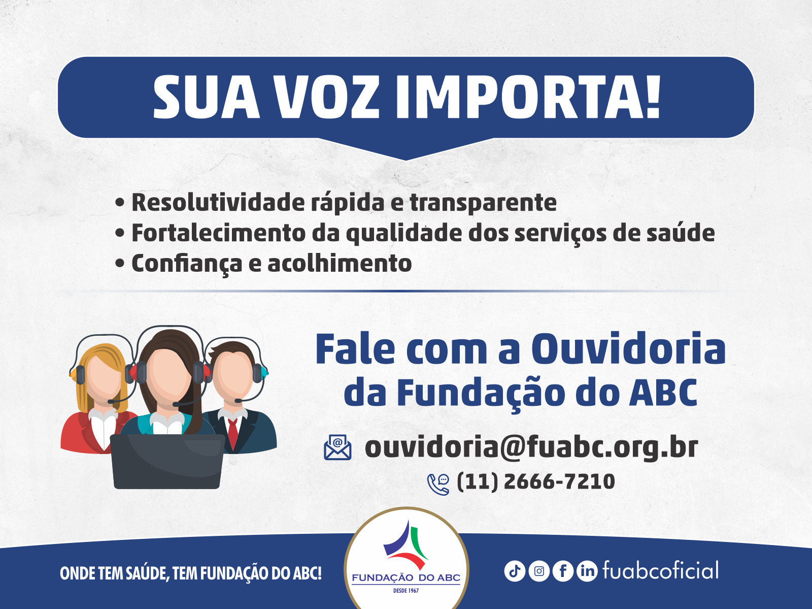 Implantado em 1º de agosto de 2020, o órgão surgiu da necessidade de um canal próprio de relacionamento com colaboradores, pacientes e usuários. Na Central de Atendimento da FUABC também funcionam outros meios de atendimento à população, como o Fale Conosco e a Lei de Acesso à Informação (LAI), vinculada à área de Transparência.