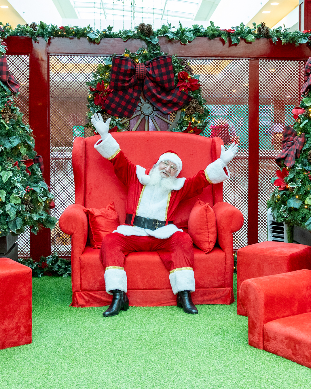 Até 24 de dezembro, o bom velhinho atende com alegria no piso L2, em frente à Cacau Show Mega Store: