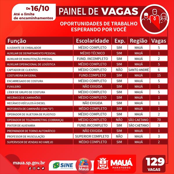 O Centro Público de Trabalho e Renda (CPTR) de Mauá, mantido pela Prefeitura, abrirá na próxima semana com 129 oportunidades profissionais, para empresas da cidade e de outros municípios do ABC. O painel é atualizado constantemente. Entre as diversas funções disponíveis estão: operador de telemarketing, costureira em geral, ajudante de embalador, auxiliar de departamento pessoal, funileiro, auxiliar de manutenção predial e pintor de alvenaria.