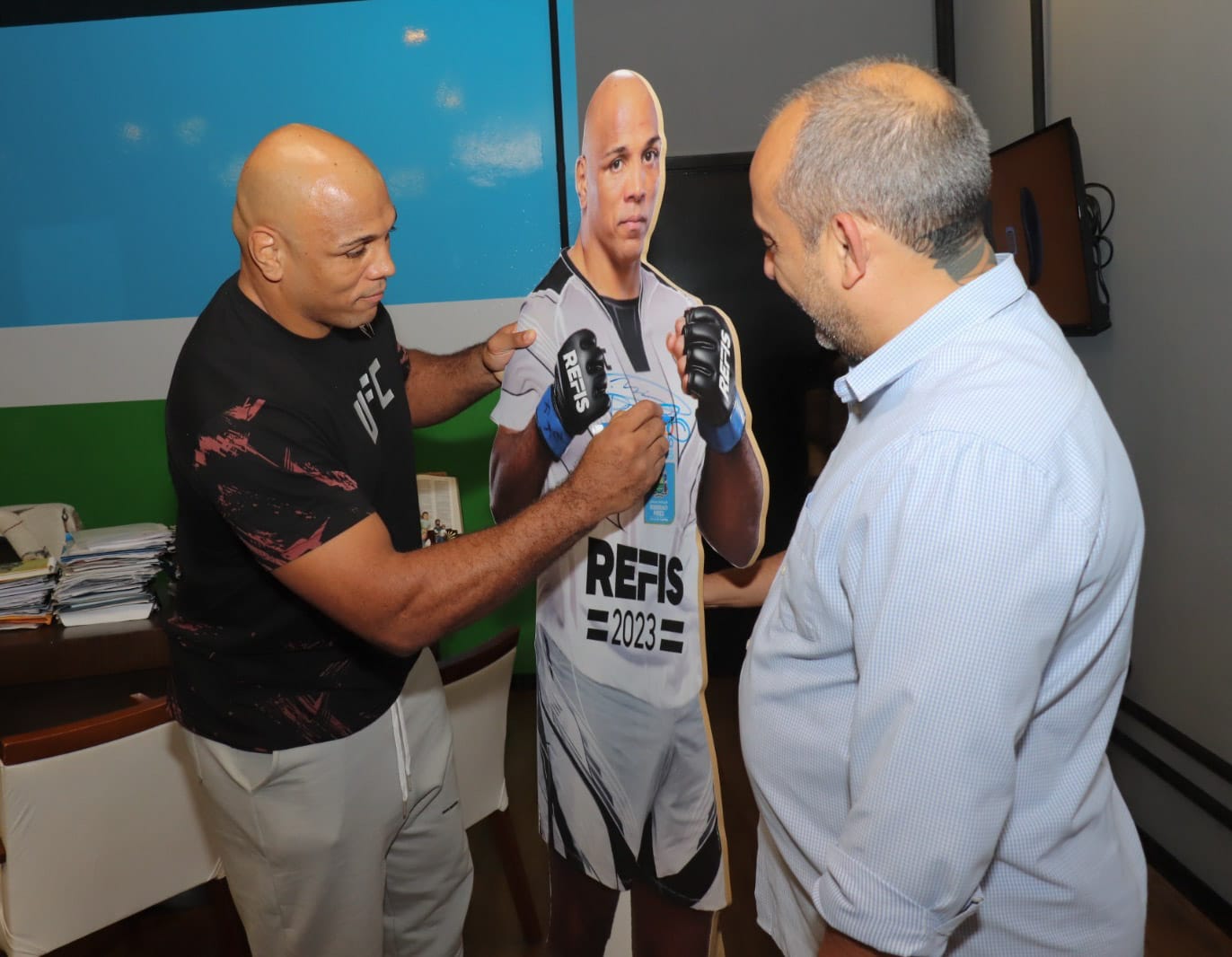 O prefeito de Ribeirão Pires, Guto Volpi, recebeu nesta quarta-feira (9), o lutador de MMA e campeão do UFC Marcos Rogério Lima, o Pezão. Natural da cidade, o atleta, que é o garoto propaganda do Refis 2023 - programa de negociação de débitos municipais, conheceu a nova estrutura do gabinete, tirou fotos com as equipes e lembrou dos primeiros passos no esporte, no Ribeirão Pires Futebol Clube e, posteriormente, em curso gratuito de box oferecido pela Prefeitura.