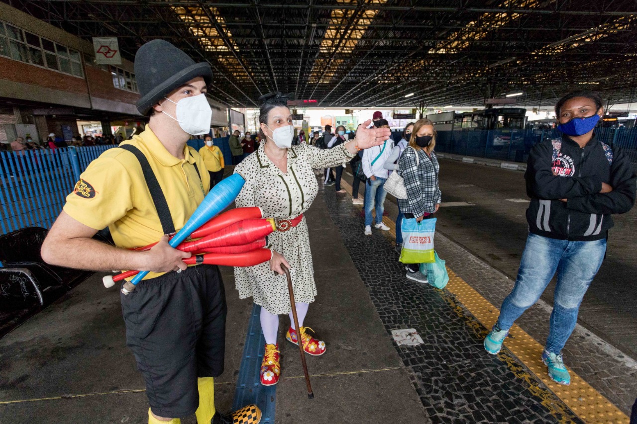 Vovó Herbina, personagem da Cia Sopa de Comédia, desembarcou no Terminal Oeste da EMTU nesta quinta-feira (16) para conscientizar os usuários do transporte público sobre o respeito aos idosos e, em tempos de pandemia, orientar sobre cuidados necessários na prevenção à Covid-19. A ideia da trupe é, de maneira lúdica, convidar os usuários do transporte público da cidade para uma reflexão que vai de encontro ao respeito a este público, seja nos meios de transporte, nas ruas e em casa.
