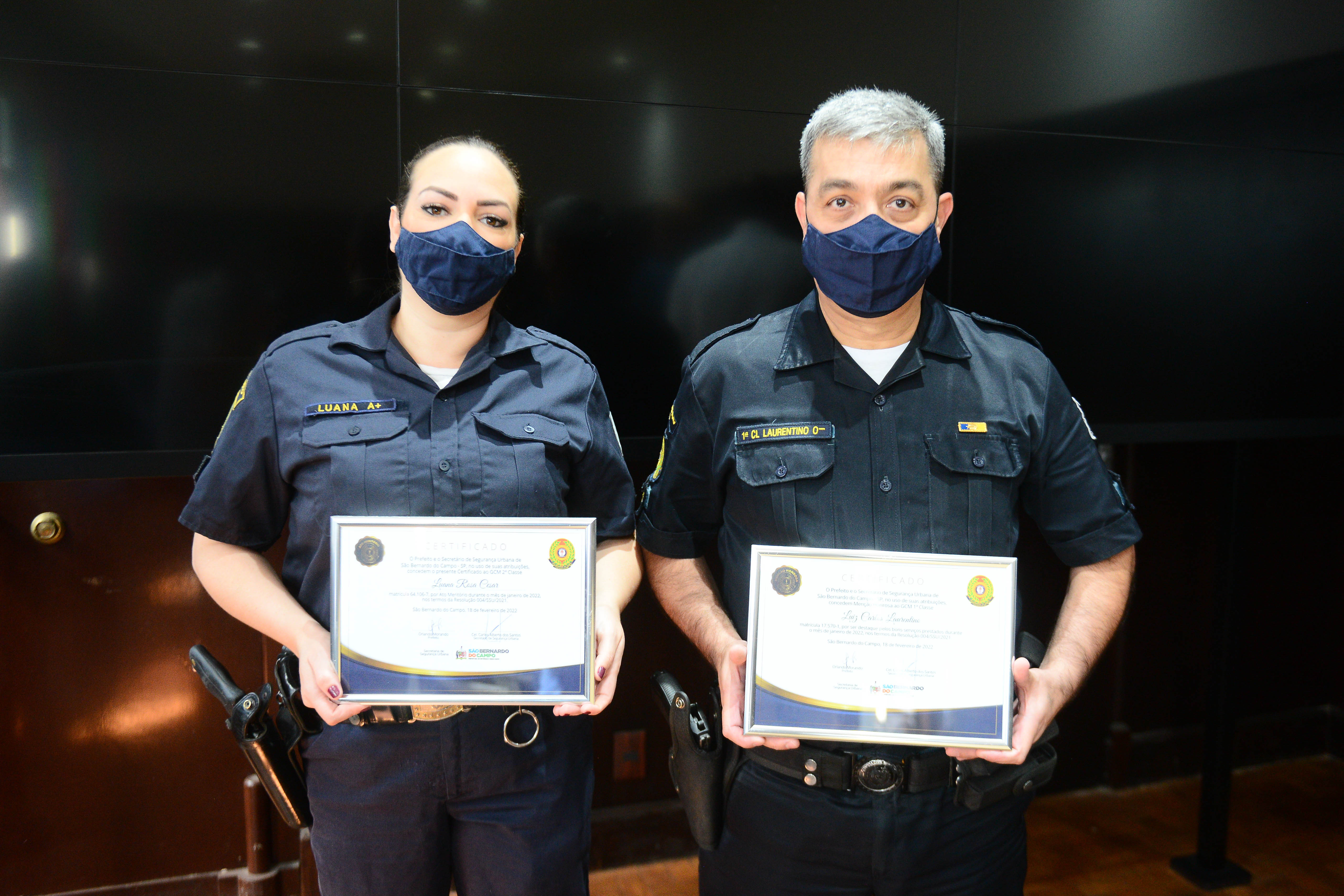 Os guardas Luiz Carlos Laurentino (GCM 1ª Classe) e Luana Rosa Cesar (GCM 2º Classe) receberam homenagem por terem atuado em uma operação que culminou com a queda de uma quadrilha especializada em roubo de veículos – três suspeitos foram detidos - e o desempenho da dupla foi preponderante para a recuperação de cinco automóveis, seis celulares e R$ 1.882 em espécie.