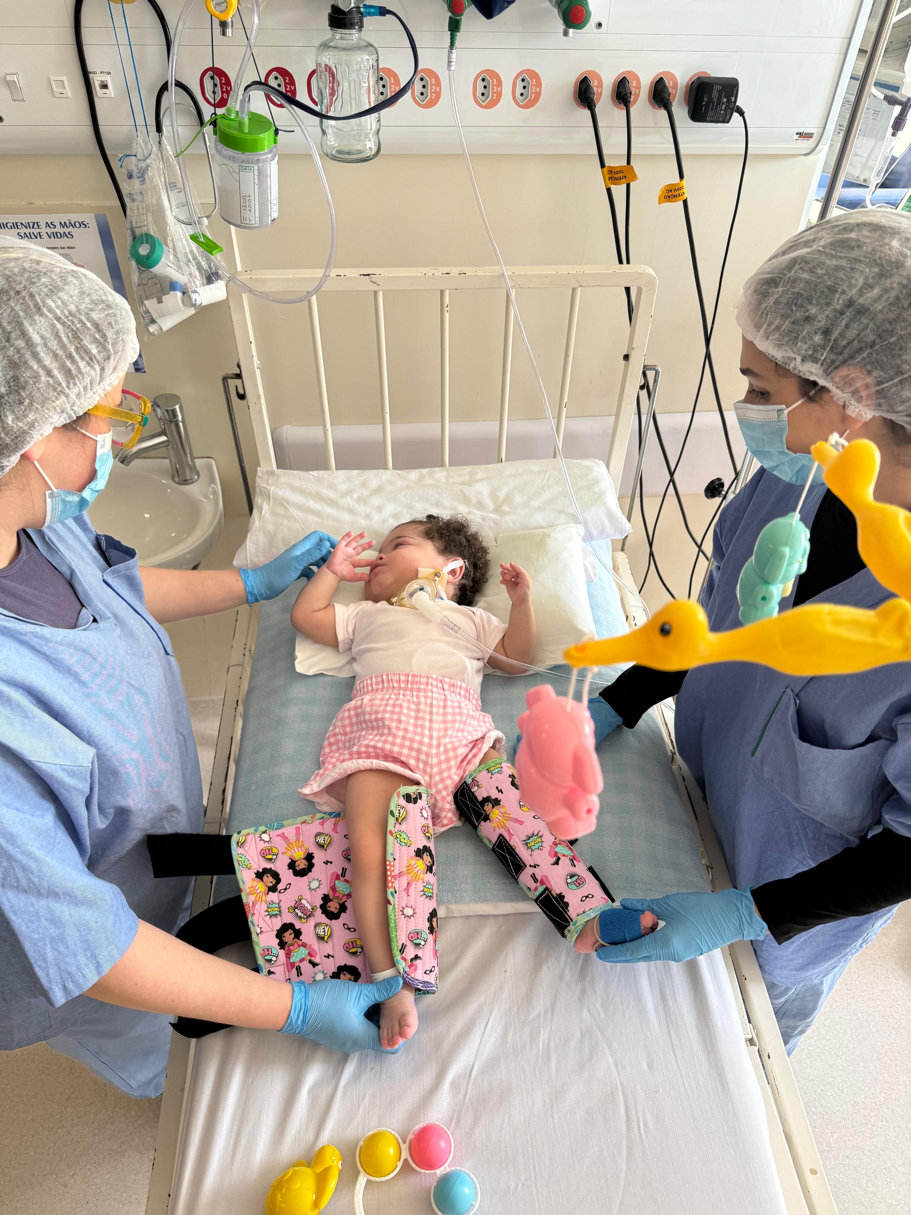 Recentemente, uma importante conquista emocionou a equipe multidisciplinar do hospital: Lívia pôde ficar em pé pela primeira vez, com o apoio de uma órtese confeccionada especialmente para ela. A iniciativa nasceu da atenção integrada dos profissionais de fisioterapia e terapia ocupacional, com o objetivo de ampliar os estímulos motores e oferecer mais qualidade de vida à criança.