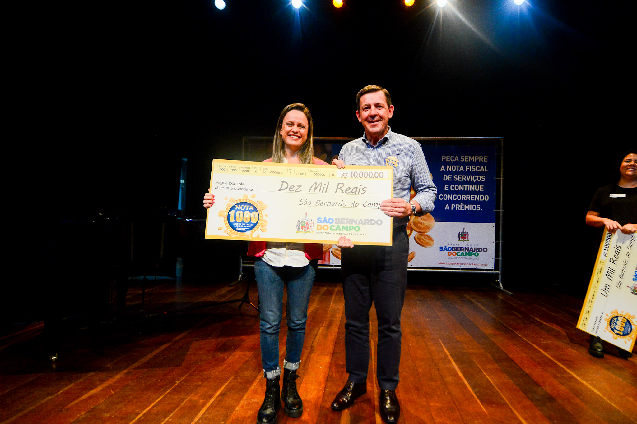 A quinta edição do ano da tradicional premiação do Programa Nota 1.000, criado pela Prefeitura de São Bernardo para incentivar o exercício da cidadania fiscal, contemplou 91 pessoas com valores em dinheiro na noite desta quarta-feira (19/10). Em cerimônia realizada no Teatro Martins Pena, na Vila Gonçalves, o prefeito Orlando Morando realizou a entrega dos cheques aos felizardos, sendo 90 no valor de R$ 1.000 e um na quantia de R$ 10 mil.