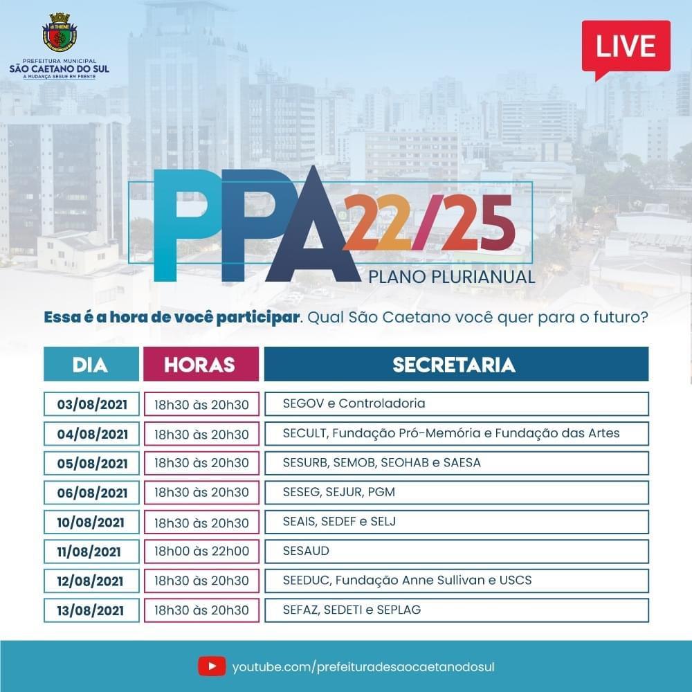 A Prefeitura de São Caetano do Sul inicia nesta terça-feira (3/8) as audiências públicas do PPA (Plano Plurianual) 2022-2025. O documento estabelecerá as diretrizes, objetivos e metas a serem seguidos pelo município pelos próximos quatro anos. Portanto, é uma grande oportunidade de a população responder qual cidade quer para o futuro.